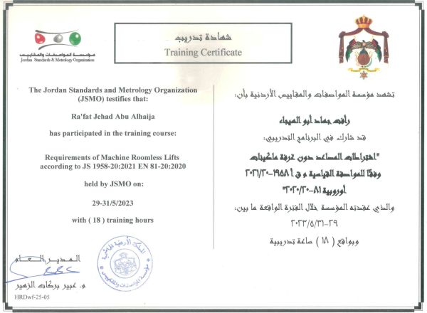 وضمن الخطة التدريبية للتطوير أتم المهندس رأفت جهاد أبو الهيجاء ، والموظف نزار رياض أبو الهيجاء دورة تدريبية بعنوان : اشتراطات المصاعد دون غرفة ماكينات (ROOMLESS) من مؤسسة المواصفات والمقاييس .